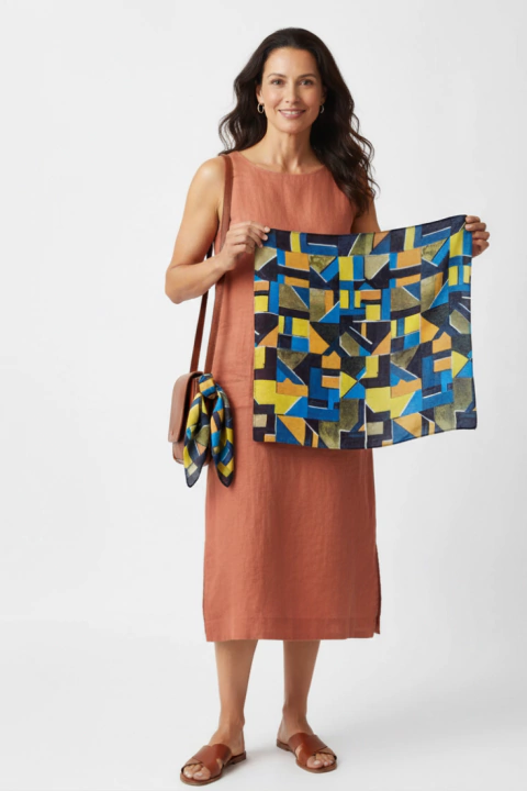 O Lenço Memórias Afetivas é uma peça artística e exclusiva, criada a partir das telas de Eliane Mourão. Com 60x60cm e confeccionado em Tecno Hidro, este lenço une elegância e arte, trazendo um toque especial ao seu estilo e evocando memórias e sentimentos através de seu design único.